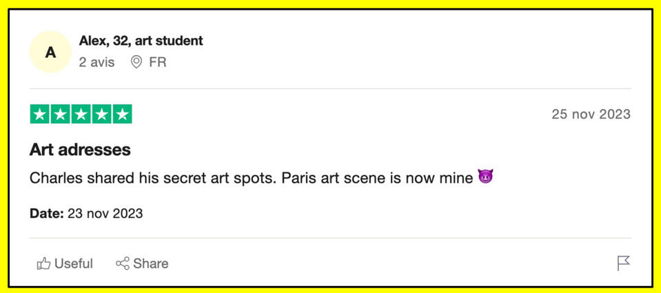 We found ordinary Parisians who know the city well. They took the time to gather their addresses.We know somebody who suits your preferences and interests
